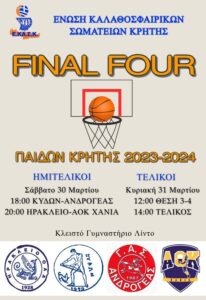 20/04/24 ΑΛΙΚΑΡΝΑΣΣΟΥ 19:00 ΠΡΩΤΑΘΛΗΜΑ ΑΝΔΡΩΝ ΚΡΗΤΗΣ ΗΡΟΔΟΤΟΣ ΟΑ ΧΑΝΙΩΝ 20/04/24 ΑΛΙΚΑΡΝΑΣΣΟΥ 21:00 ΠΡΩΤΑΘΛΗΜΑ ΑΝΔΡΩΝ ΚΡΗΤΗΣ ΑΣΚΗΣΗ ΑΓ. ΝΙΚΟΛΑΟΣ ΚΑΛΑΘΟΣΦΑΙΡΙΣΗ 20/04/24 ΧΑΝΙΩΝ 16:00 ΠΡΩΤΑΘΛΗΜΑ U15 ΚΟΡΙΤΣΙΑ 2ΟΣ ΟΜΙΛΟΣ ΑΟ ΚΥΔΩΝ ΚΙΣΣΑΜΟΥ ΑΟ 20/04/24 ΧΑΝΙΩΝ 18:00 ΠΡΩΤΑΘΛΗΜΑ ΑΝΔΡΩΝ ΚΡΗΤΗΣ ΑΟ ΚΥΔΩΝ ΑΚΑΔΗΜΙΑ BC 20/04/24 ΙΕΡΑΠΕΤΡΑΣ 17:00 ΠΡΩΤΑΘΛΗΜΑ ΑΝΔΡΩΝ ΚΡΗΤΗΣ ΑΟΚ ΙΕΡΑΠΕΤΡΑ ΠΕΔΙΑΔΑ ΑΟΧ 20/04/24 Β.Α.Κ. 10:00 ΠΡΩΤΑΘΛΗΜΑ U15 ΑΓΟΡΙΑ 3ΟΣ ΟΜΙΛΟΣ ΟΦΗ 2 ΗΡΟΔΟΤΟΣ 2 20/04/24 Β.Α.Κ. 12:00 ΠΡΩΤΑΘΛΗΜΑ U15 ΚΟΡΙΤΣΙΑ 1ΟΣ ΟΜΙΛΟΣ Ο.Φ.ΗΡΑΚΛΕΙΟΥ ΕΡΓΟΤΕΛΗΣ Γ.Σ. 21/04/24 ΛΙΝΤΟ 12:30 ΠΡΩΤΑΘΛΗΜΑ ΓΥΝΑΙΚΩΝ…